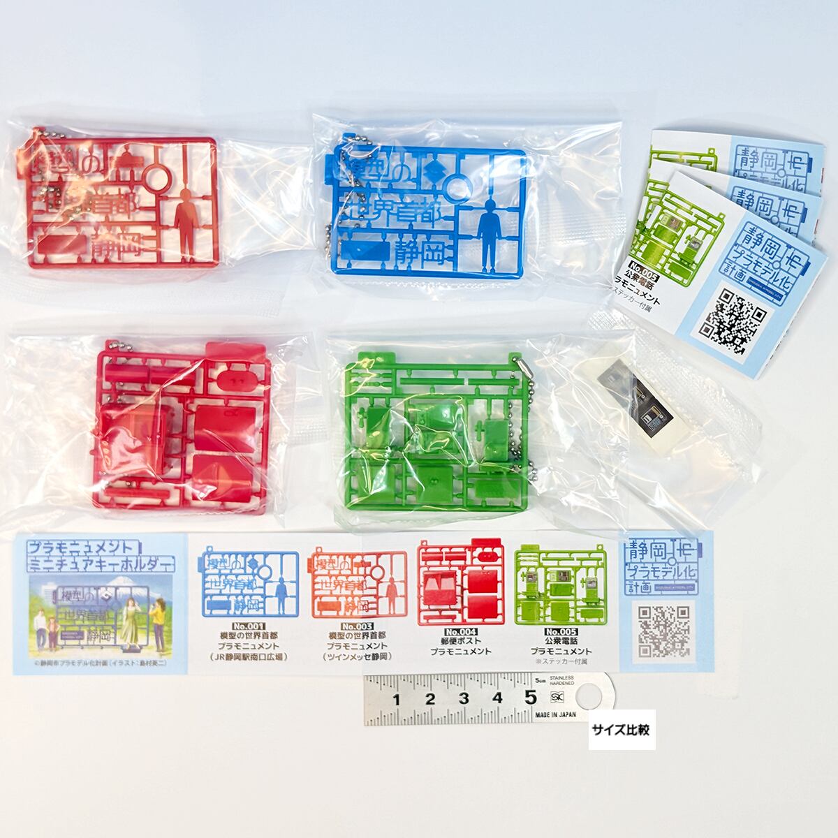 約5.8cmのちょうど良い手のひらサイズで、全種ボールチェーン付き、郵便ポストや公衆電話などが、まるでプラモデルのランナーに付いたままのようなユニークなデザインで再現されています。