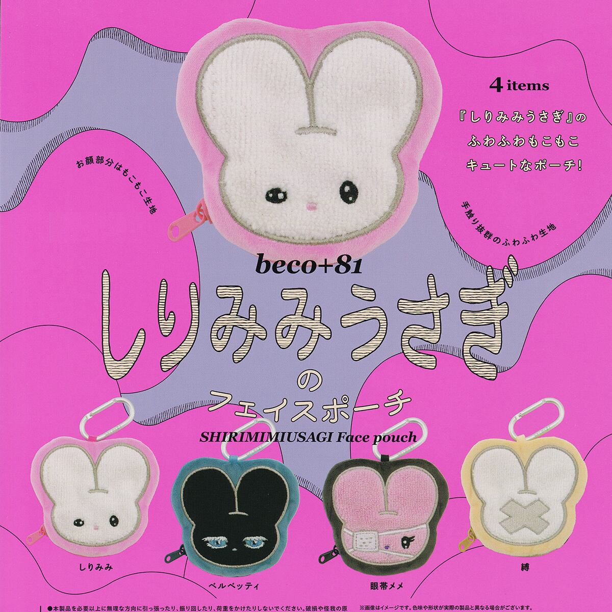 大人気イラストレーター・beco(+81)氏が描く「しりみみうさぎ」が、ふわふわもこもこのキュートなフェイスポーチになってカプセルトイに新登場です。