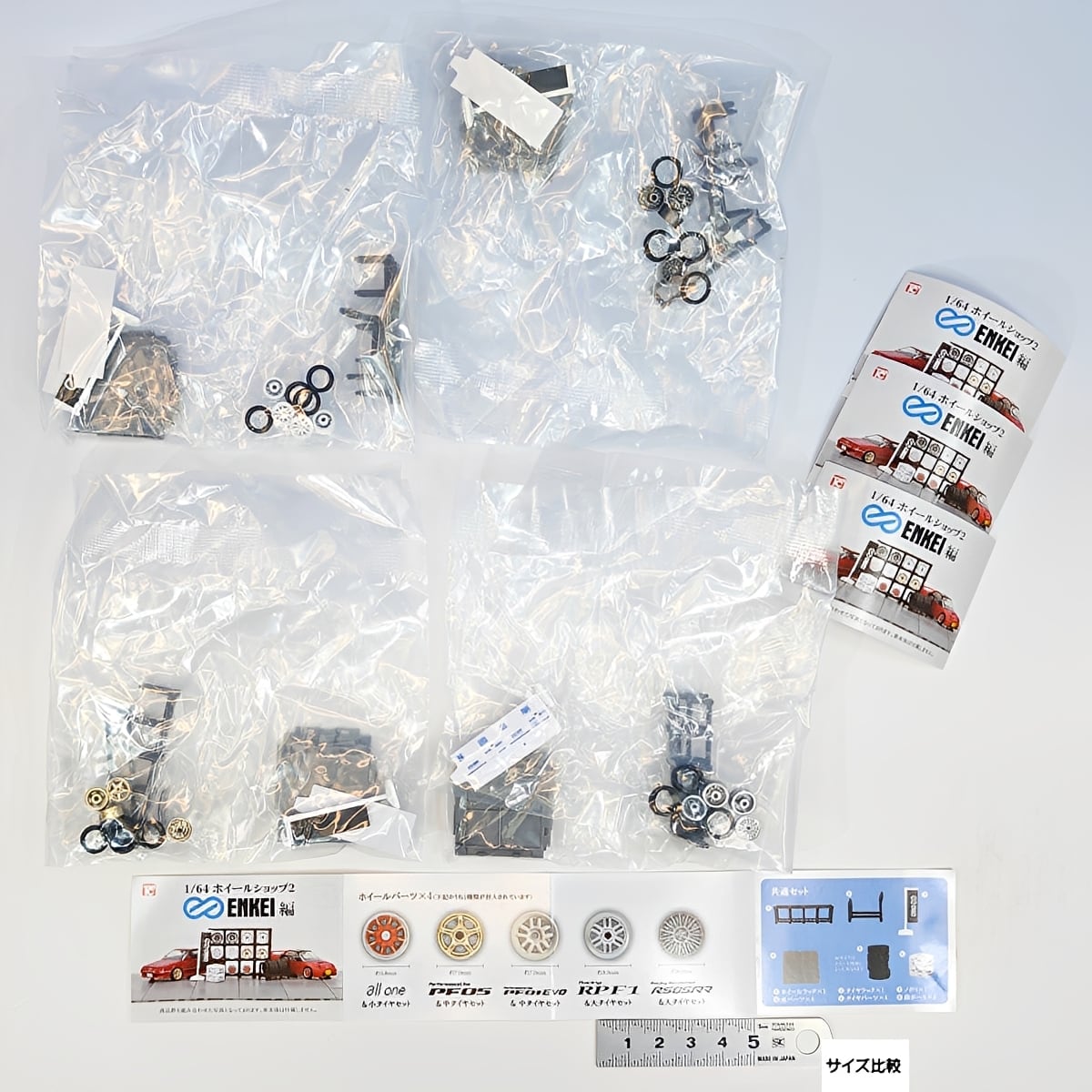 各セットにはホイールのほか、ゴムタイヤ、旗、床板パーツ、さらにタイヤラックやのぼりといったジオラマ小物も付属します。お気に入りの一台をディスプレイして、自分だけのショップを再現しましょう!