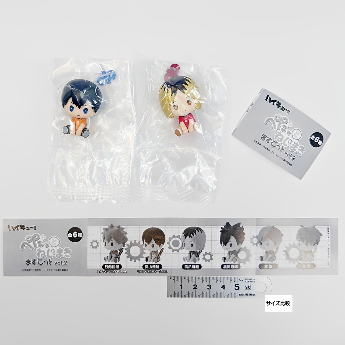 日向や影山のセカンドユニフォームVer.に加え、音駒の研磨と黒尾、稲荷崎の宮兄弟という豪華ラインナップ。全高約45mmのぺたっと座った姿が愛らしく、デスク周りの癒やしに最適です。