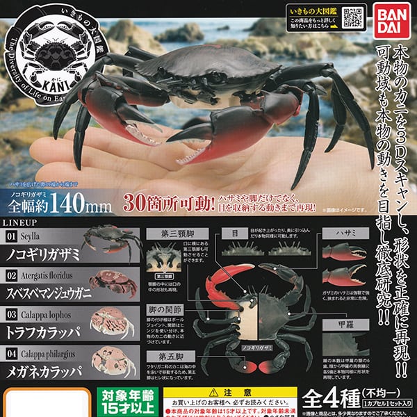 かに KANI いきもの大図鑑 蟹 カニ 生き物 動物 模型 フィギュア 3Dスキャン 形状再現 ガチャ バンダイ(全4種フルコンプセット+DP台紙おまけ付き)