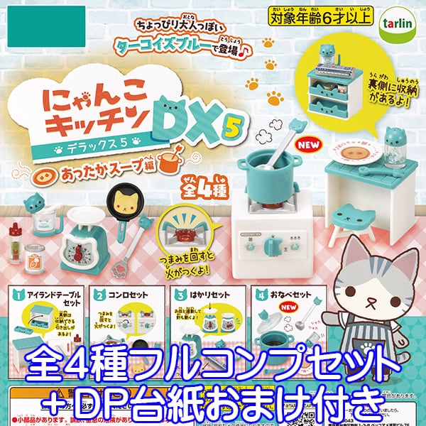 にゃんこキッチン DX5 あったかスープ編 カプセル コレクション グッズ ターコイズブルー 模型 猫 ねこ ネコ ガチャ ターリン・インターナショナル(全4種フルコンプセット+DP台紙おまけ付き)