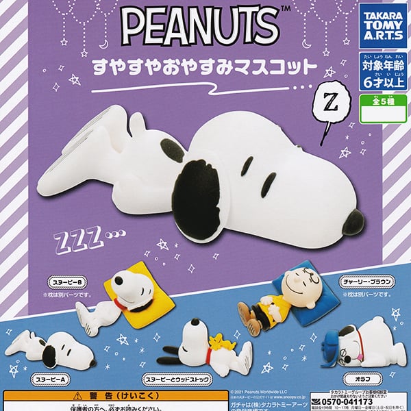 PEANUTS すやすやおやすみマスコット スヌーピー グッズ キャラクター フィギュア ピーナッツ ガチャ タカラトミーアーツ(全5種フルコンプセット+DP台紙おまけ付き)