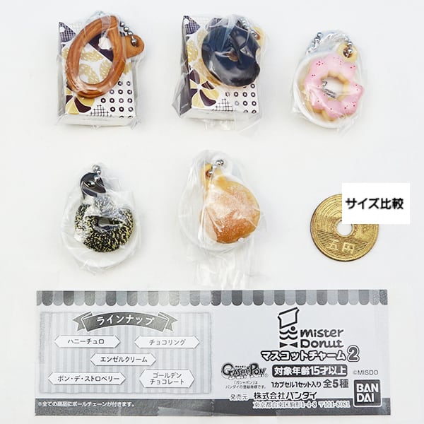 ミスタードーナツ マスコットチャーム2 mister Donut グッズ ミニチュア フィギュア ガシャポン ガチャ バンダイ(全5種フルコンプセット+DP台紙おまけ付き)