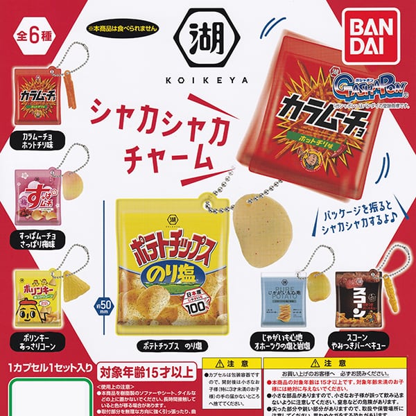 湖池屋 シャカシャカチャーム KOIKEYA グッズ スナック菓子 パッケージ デザイン ミニチュア フィギュア ガシャポン ガチャ バンダイ(全6種フルコンプセット+DP台紙おまけ付き)