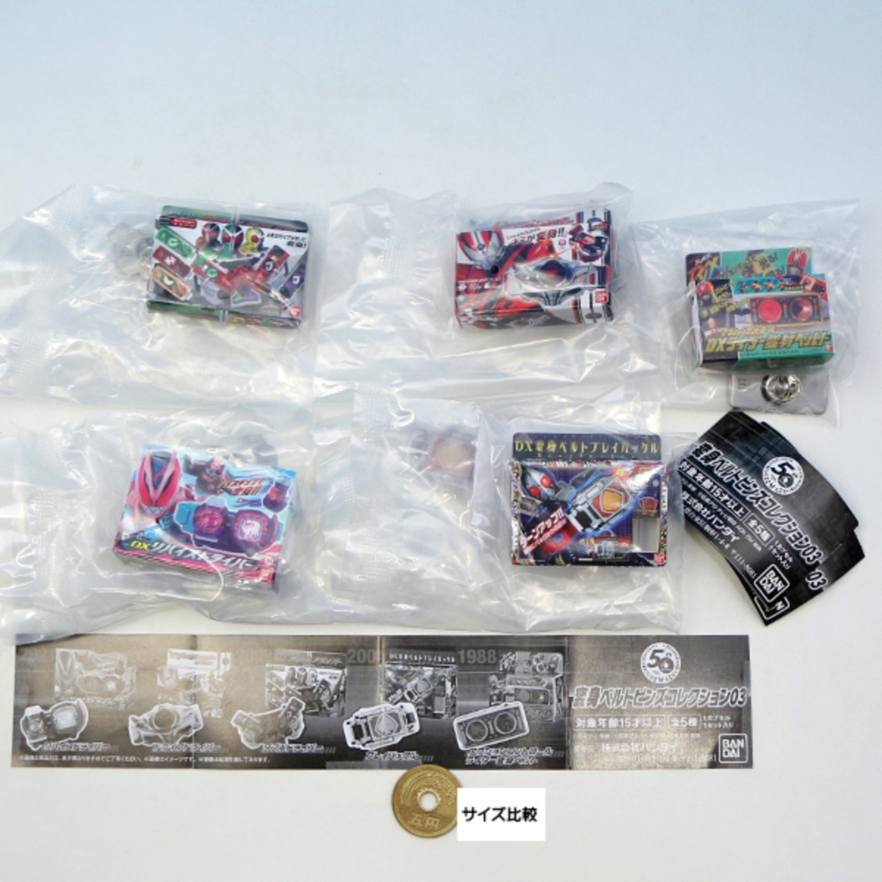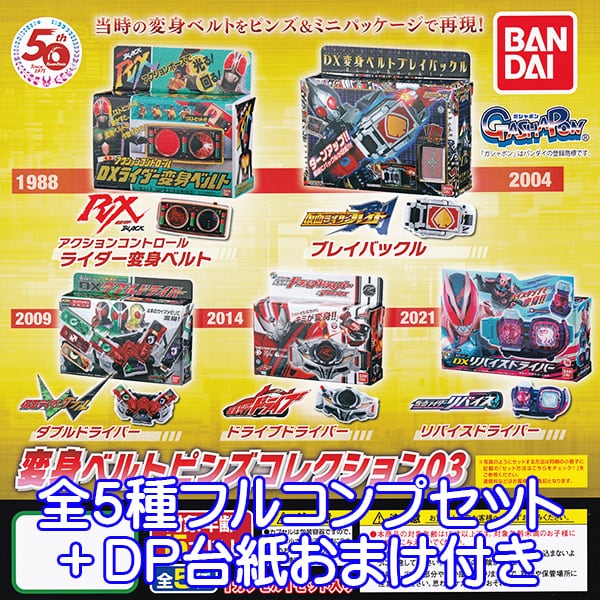 仮面ライダーシリーズ 変身ベルトピンズコレクション03 特撮ヒーロー 50th 変身ベルト ミニチュア パッケージ グッズ フィギュア ガチャガチャ ガシャポン バンダイ(全5種フルコンプセット+DP台紙おまけ付き)
