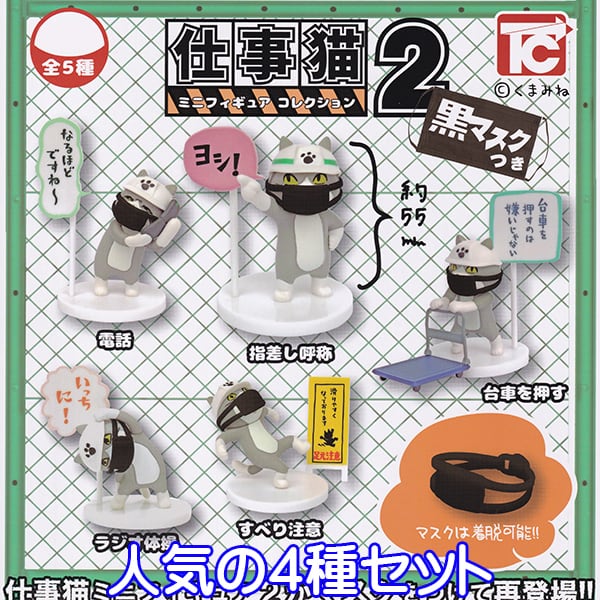 仕事猫ミニフィギュアコレクション2 黒マスクつき 猫 工事現場 くまみね 動物 キャラクター グッズ フィギュア ガチャ トイズキャビン(人気の4種セット)