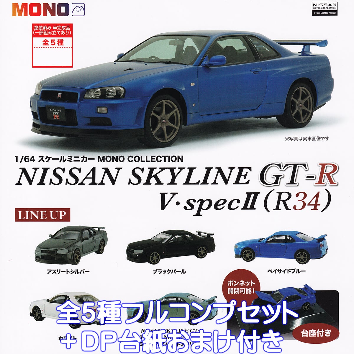 1/64 スケールミニカー MONO COLLECTION NISSAN SKYLINE GT-R V・spec II (R34) プラッツ 【全5種フルコンプセット+DP台紙おまけ付き】 日産 スカイライン ミニカー グッズ フィギュア ガチャガチャ 【即納 在庫品】【数量限定】