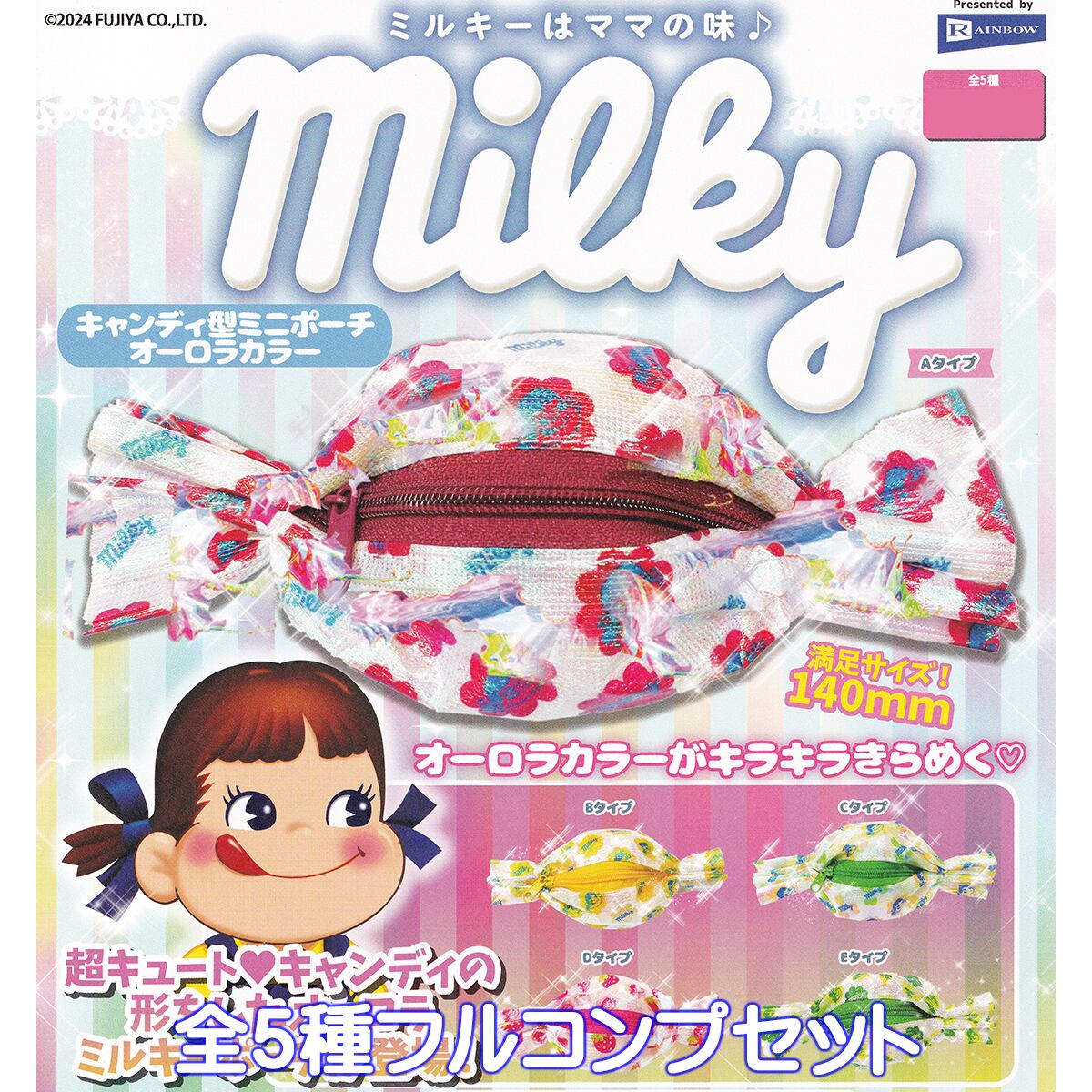 ミルキー キャンディ型ミニポーチ オーロラカラー レインボー 【全5種フルコンプセット】 不二家 milky ペコちゃん グッズ 小物入れ ガチャガチャ カプセルトイ【即納 在庫品】【数量限定】【フルコンプリート】